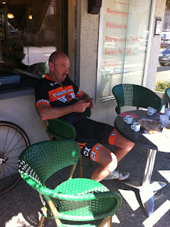Nouvelles roues disions nous pour celui qui après avoir testé cosmics , amc 350 et shimano dura ace ,vient de craquer pour des XRACE 80mm a boyaux au look et au bruit hors du commun .Le "hic",c'est que quelque peu novice dans la connaissance des boyaux , son choix s'était porté sur des VITTORIA CRONO slick de 160 grammes ...L'arme absolue pour les chronos sur le billiard suisse mais pas vraiment la panacée sur les routes gravillonneuses du jura ,et sur un freinage trop appuyé la chappe du "siffleur" s'ouvrira sur 5 ou 6 bons centimètres ! Sans boyau de rechange ,christian ne repartira pas du petit déjeuner improvisé dans une boulangerie du coin ...CHRISTINA se chargeant de venir secourir son héros !